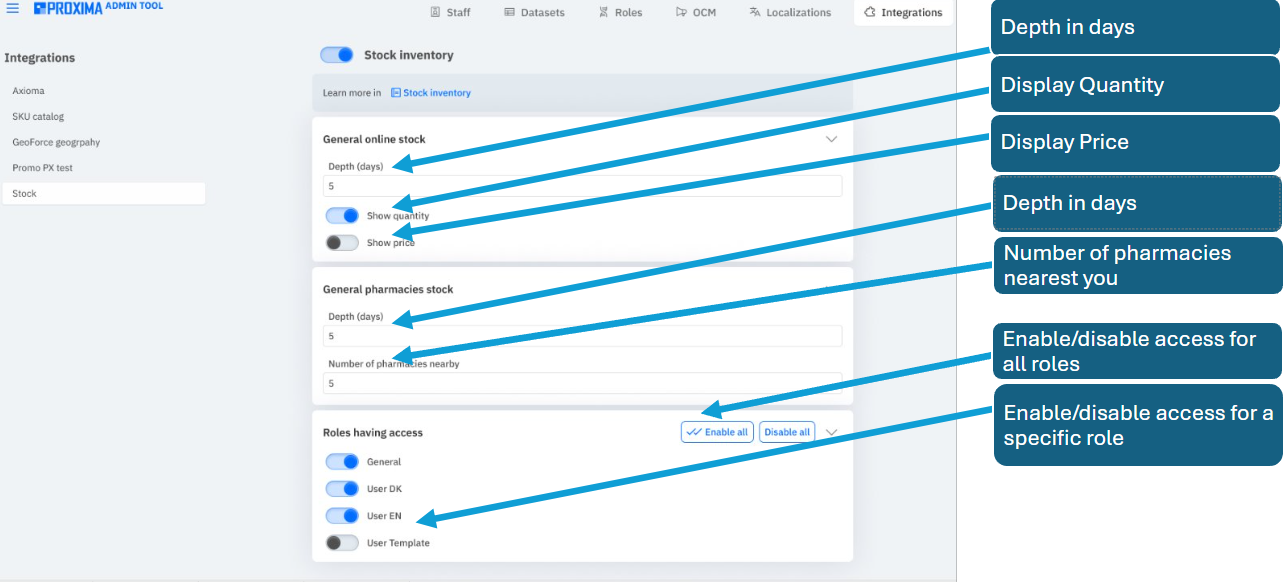 - In the Nearby Pharmacy Stock section, you can change the number of days for which data will be shown, as well as specify the number of pharmacies to be included in the "Pharmacy Nearby" indicator.