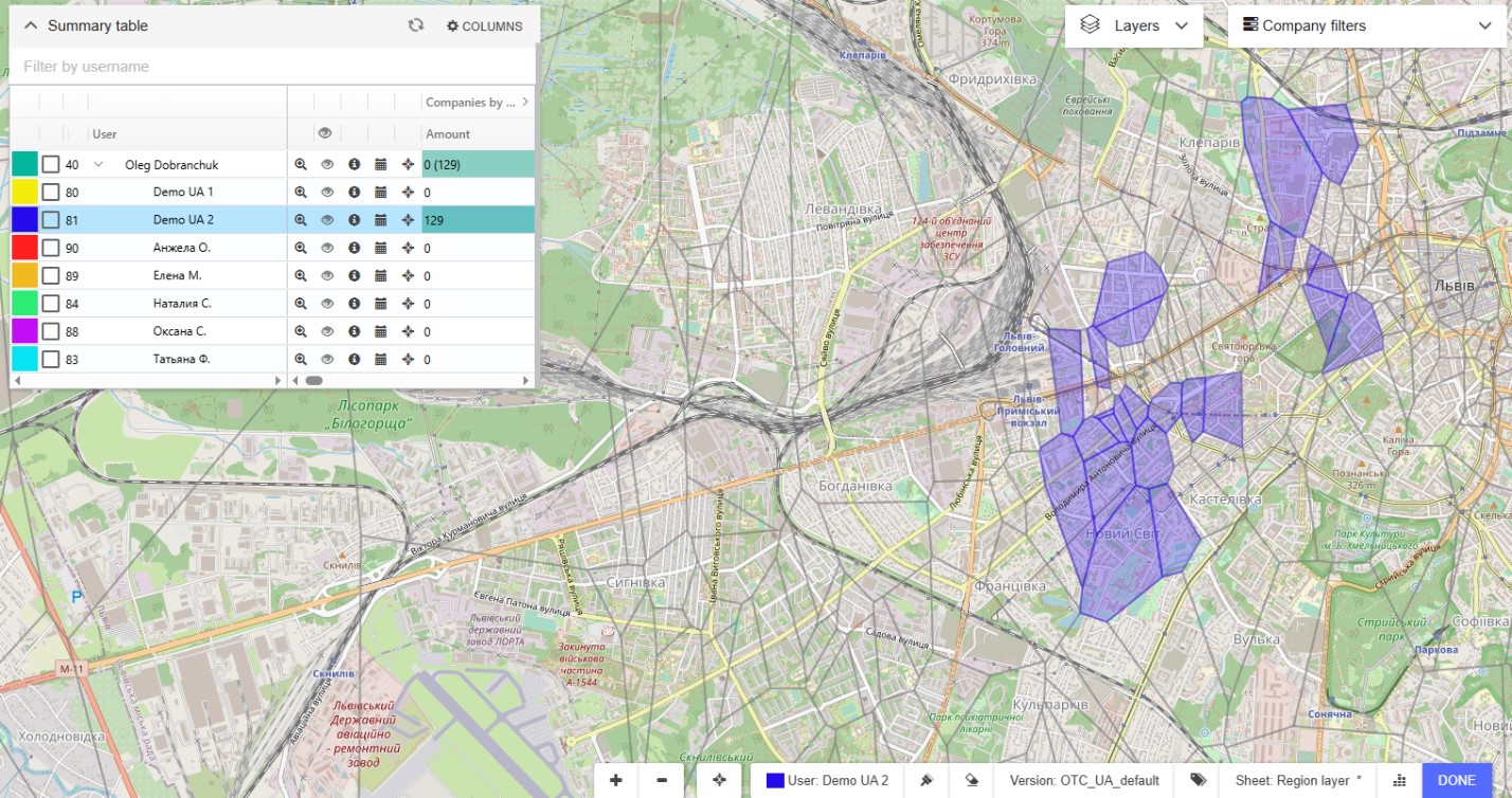 Displays all info for the polygon, including Sales, Visits, Promotions, Employees, Number of Organizations and Specialists
