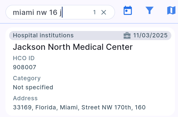 - Busque la empresa en la base de datos activa utilizando términos clave (por ejemplo, nombre de la calle, nombre de la empresa). Asegúrese de que todos los filtros estén desactivados.
