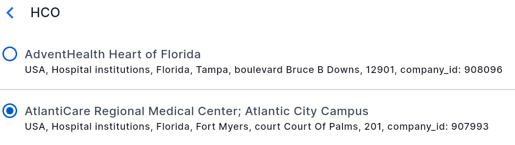 - Тізімнен қажетті мекемені таңдаңыз. Тізімде клиенттің негізгі жұмыс орны және оның профиліндегі Қосымша ақпарат бөлімінде көрсетілген барлық қосымша жұмыс орындары көрсетіледі.