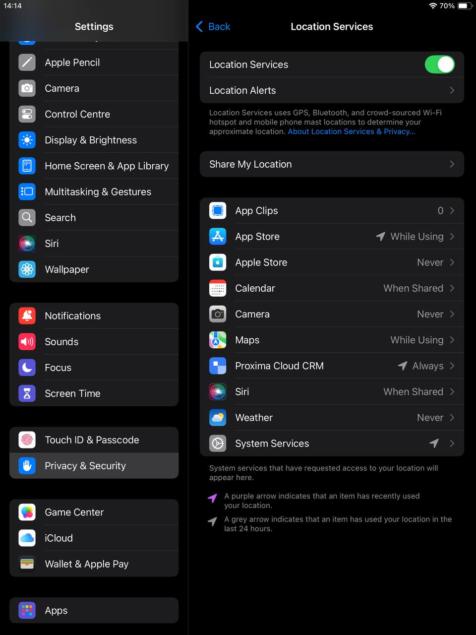 - Планшет баптауларына кіріңіз → Қауіпсіздік және Құпиялылық → Орналасу бөліміне өтіңіз.