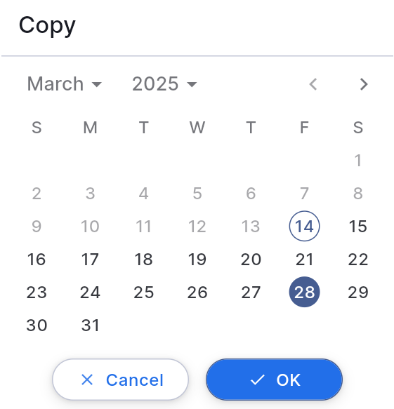 - Após clicar em Mover, a janela do calendário será exibida. Selecione a data para a qual deseja mover as atividades e clique em OK. Na parte inferior da janela do calendário, você encontrará duas opções adicionais:
