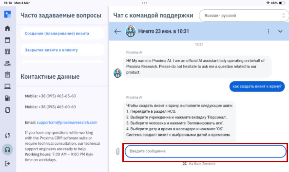 Чатбот Proxima AI — это современный и удобный инструмент для ознакомления с базовым функционалом Proxima Cloud CRM (расположением и функцией модулей, терминологией внутри продукта, взаимосвязью между модулями, инструкциями по использованию и т. д.), а также возможности в любой момент связаться с инженером технической поддержки Proxima Research International в реальном времени, если консультации виртуального ассистента окажется недостаточно для решения вопроса.