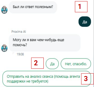 Если вы удовлетворены и больше не имеете вопросов — вы можете нажать либо кнопку «Нет, спасибо» (завершение сессии с чат-ботом), либо кнопку «Отправить для анализа сеанса» (5). В случае выбора «Отправить для анализа сеанса» мы зафиксируем вашу сессию с нашей стороны для её анализа с целью улучшения работы алгоритма чат-бота.