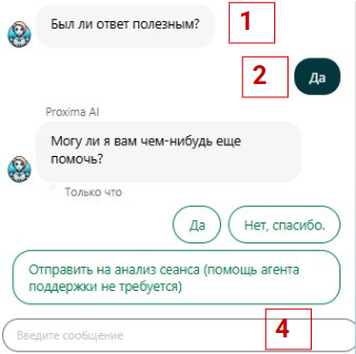 Если вы выбираете вариант «Да» (2), вы можете продолжить общение с чат-ботом и задать следующий или уточняющий вопрос (4).