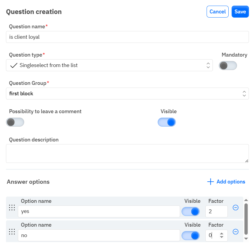 Для кожної відповіді (якщо вона не цифрова) можна задати вагу / оцінку.Коригування анкет
