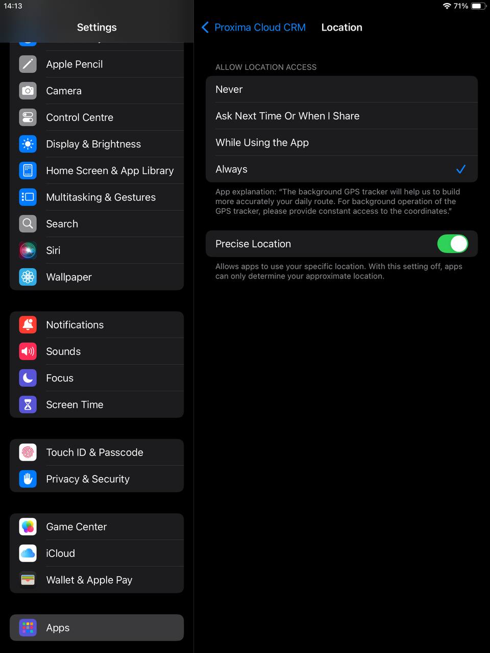 - Proxima Cloud CRM uchun ruxsat Har doim qilib o‘rnatilganligini tekshiring.